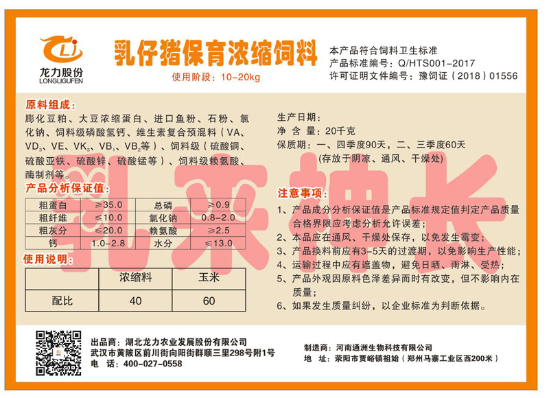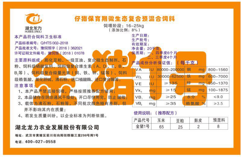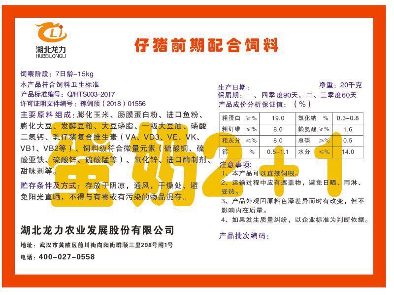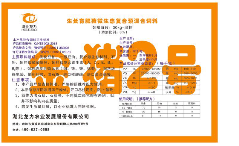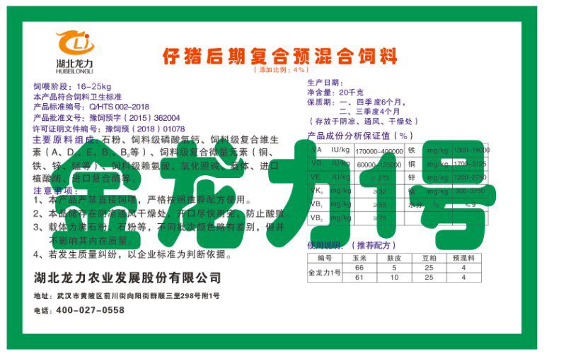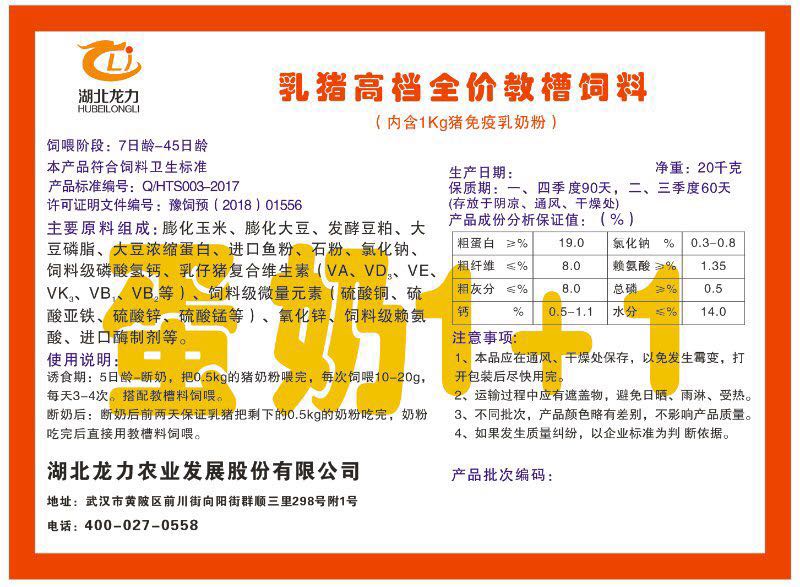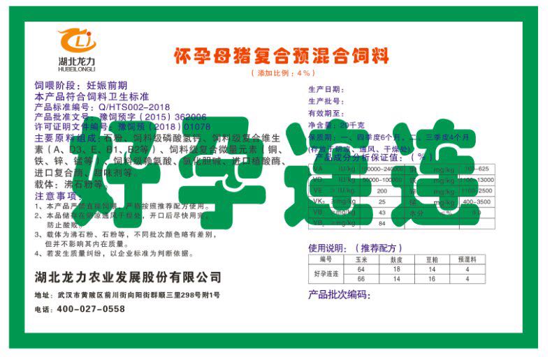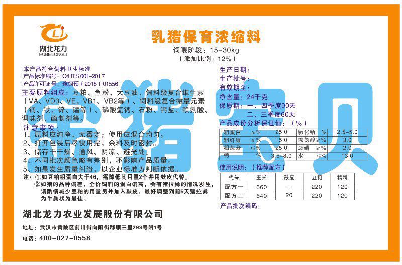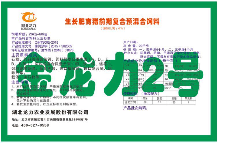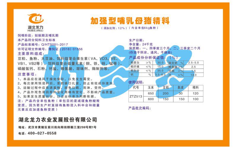 湖北龍力農(nóng)業(yè)發(fā)展股份有限公司坐落于武漢市黃陂區(qū)前川街向陽街群順三里298號附1號。公司成立于2014年6月,公司自成立以來把“創(chuàng)全球最大養(yǎng)豬綜合服務”為企業(yè)愿景。致力于打造教保料品牌”作為公司發(fā)展的明確目標。公司一直致力于豬營養(yǎng)的研究和開發(fā),積極與國內外高校和科研機構合作,推廣養(yǎng)豬技術、動物營養(yǎng)新概念,向世界農(nóng)牧企業(yè)學習與合作。公司采用國內先進的生產(chǎn)工藝,選擇高精度電子配料秤,高均勻度、無殘留混合機等先進設備....